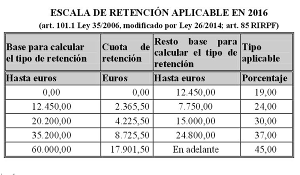 Toda vez calculados los importes de ambos conceptos se aplica también a ambos la misma escala de retención que puede verse a continuación: