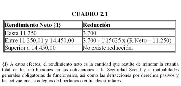 Su base de cálculo estará constituida por los 15.000 euros, cantidad a la que habrá que restar sus aportaciones a la Seguridad Social -el 6,35% de su retribución bruta ó 952,5 euros-, su reducción por obtención de rendimientos del trabajo -esto es, 3.700 euros menos 1,15625 * (14.047,5 menos 11.250), ó 465,39- y gastos deducibles por 2.000 euros, resultando un total de 11.582,11 euros.