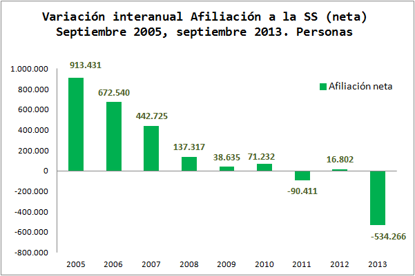 Se ve cómo desde el año 2005 la evolución de esta variable ha experimentado un decrecimiento constante hasta el punto de registrar en septiembre de 2013 una afiliación neta de -534.266 personas.