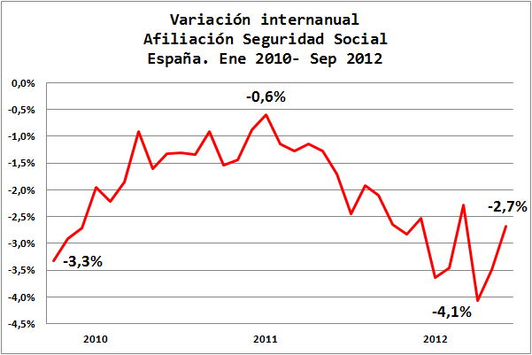 2- Oiga, permítame que haga un reconocimiento de todos los crecimientos en la afiliación de trabajadores a los regímenes de la Seguridad Social que pudieran haberse producido antes del año 2010, pues al menos desde entonces, mes tras mes, las variaciones interanuales han sido negativas.