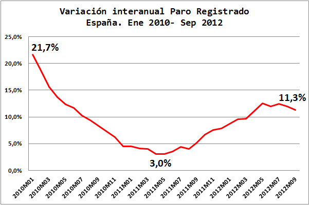 5 – Señoras y señores, insisto, la tasa interanual de paro registrado no ha dejado de aumentar desde, al menos, el comienzo de la serie que aquí se observa (enero de 2010). Permítanme, por tanto, que haga un reconocimiento, no de las tasas del 21,7% o de la más reciente del 11,3% de septiembre de 2012, sino de todas aquellas, mire usted, “que no salen en las portadas de la prensa”.